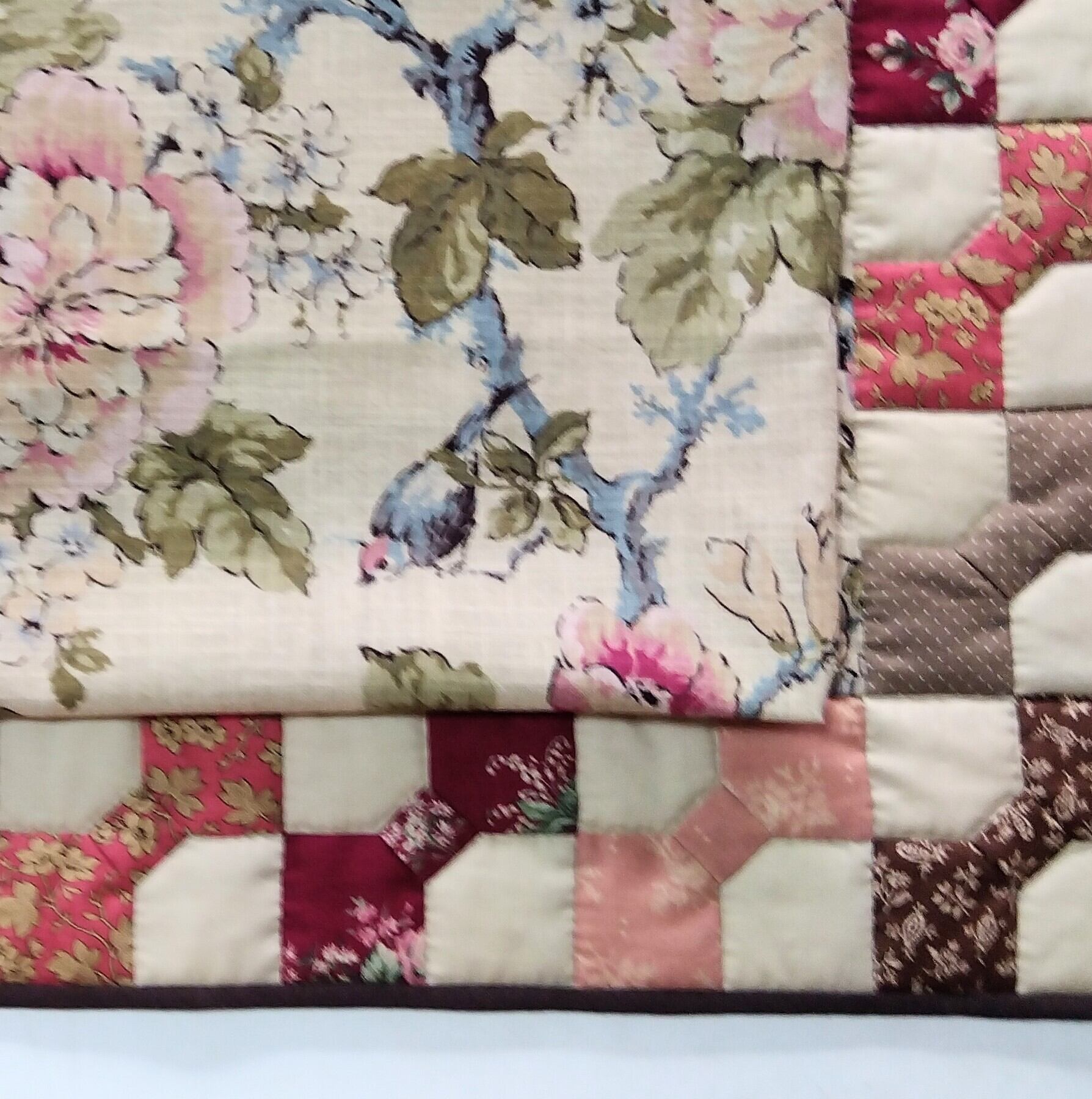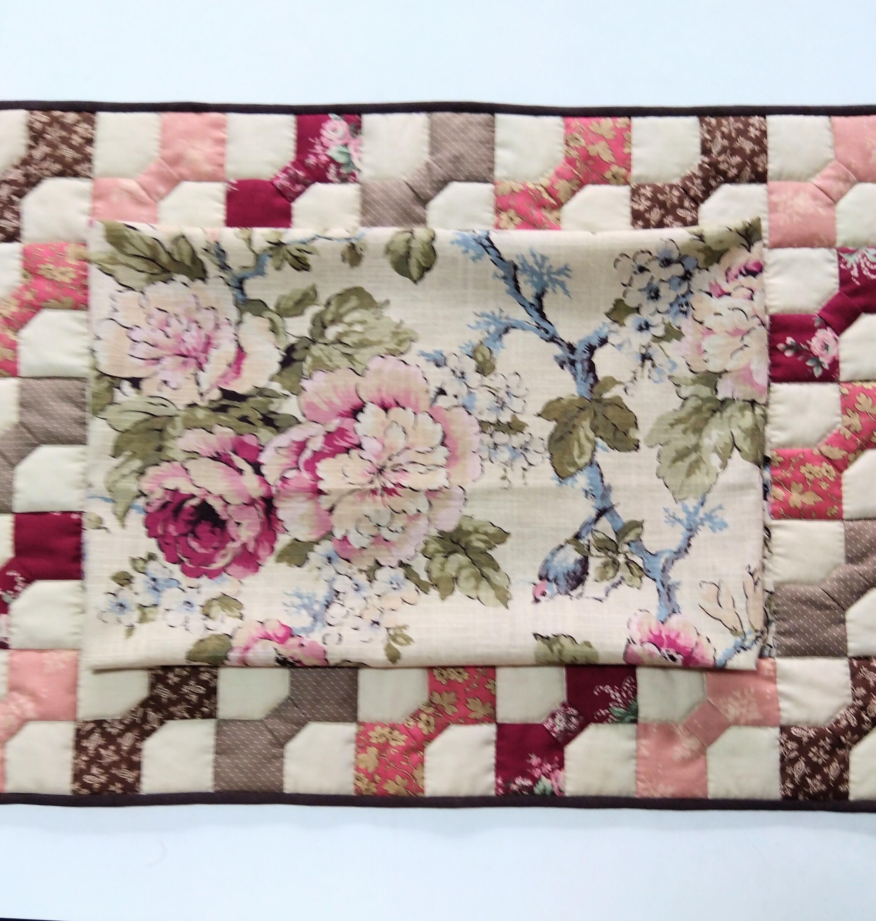 花柄のまわりにボウタイのピースワークをプラスしたマットです。ボウタイは比較的作りやすいパターンです。玄関やリビングの一角、ベッドサイドなど、お好きな場所に置いて、暮らしを楽しみましょう。