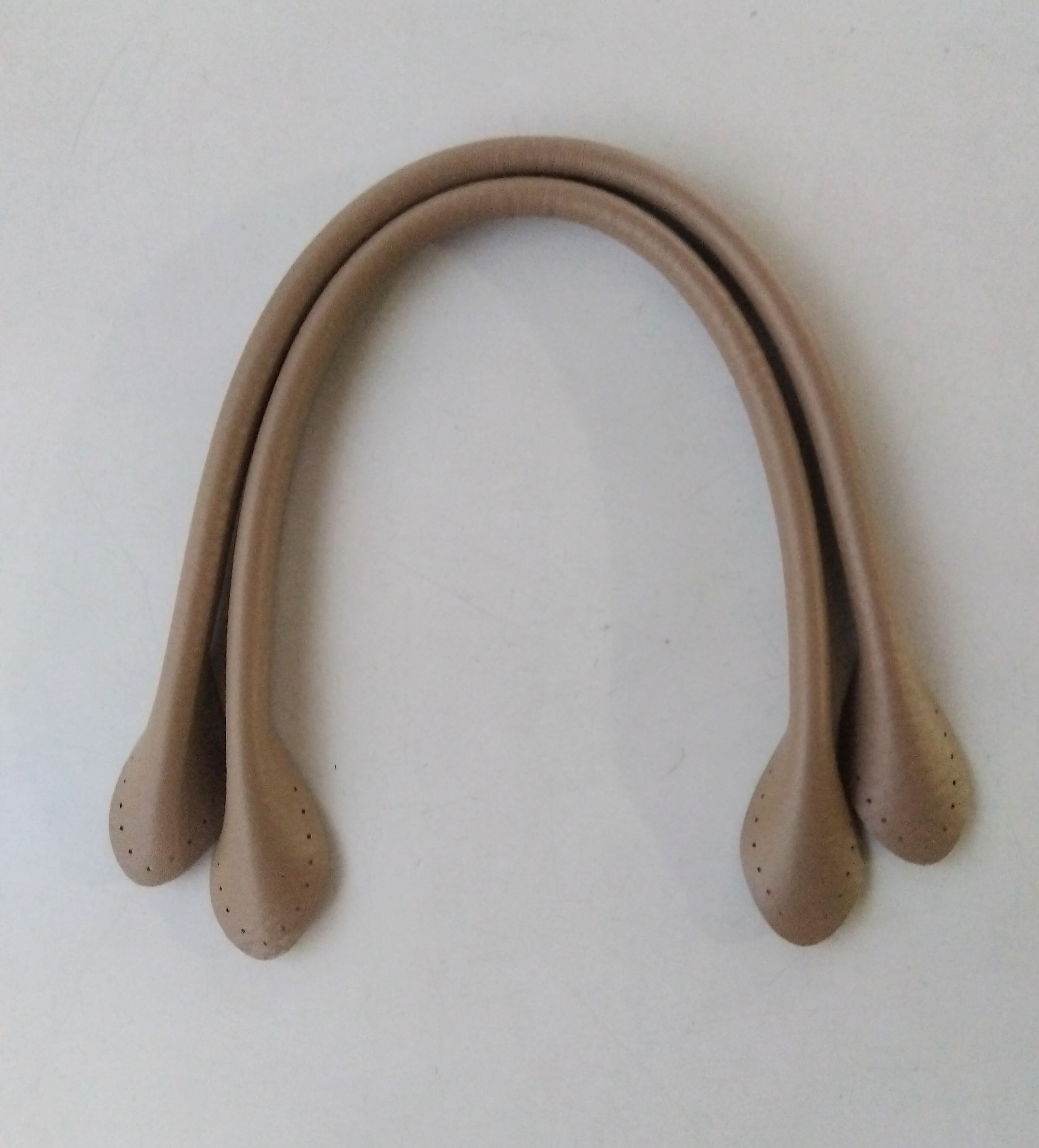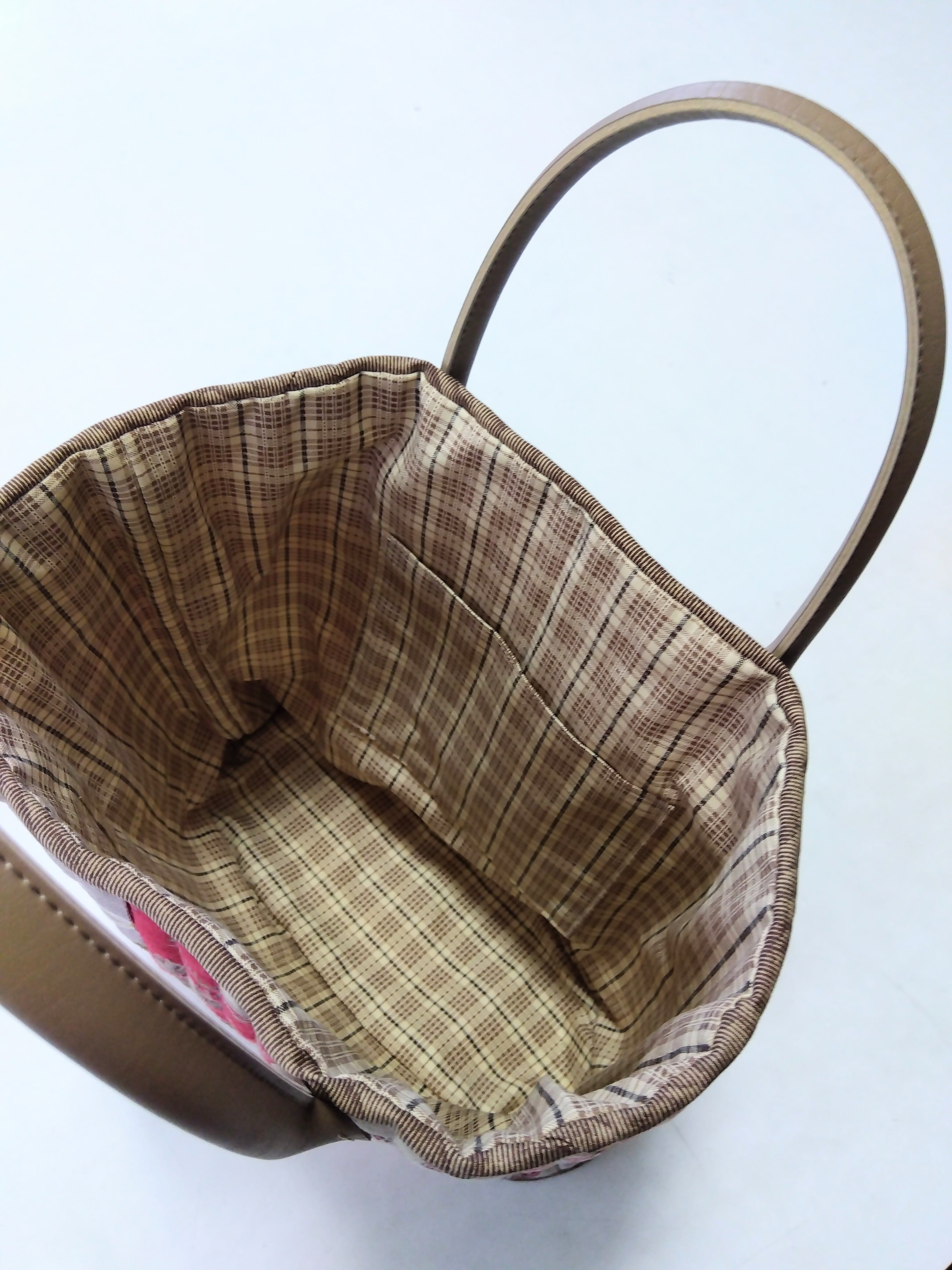 バッグはだ円底なので安定感があります。合成皮革の持ち手を本体に直接縫い付けます。